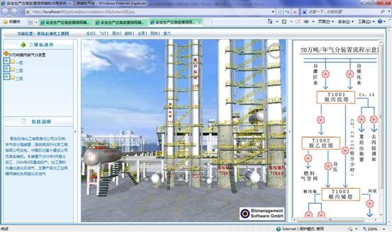 系統(tǒng)集成三維模型子系統(tǒng),根據(jù)企業(yè)名稱或者關鍵設備智能關聯(lián)到三維模型頁面。如下圖所示,左側菜單顯示當前企業(yè)所有的三維模型標準件,右側顯示裝置生產流程示意圖,點擊菜單或者流程圖節(jié)點皆可直接切換到相關視點。