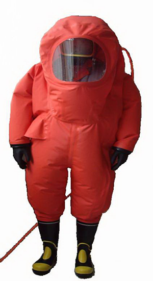 2、結(jié)構(gòu)特征:服裝為連體式全封閉結(jié)構(gòu),外置背囊可佩帶正壓式空氣呼吸器,頭部裝有單項(xiàng)通風(fēng)閥(排氣),接縫處牢固緊密,且用于高溫?zé)岱鈾C(jī)加溫高壓連接合縫,面屏為硬質(zhì)透明PC材質(zhì)(抗沖擊,耐酸堿)耐酸堿防化手套采用卡環(huán)可拆卸式連接,具有良好的密性,且便于更換。