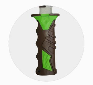 刀背帶鋸齒設(shè)計(jì),帶缺口,無(wú)刀頭,帶快卡扣,硬塑料刀鞘手柄帶護(hù)口。