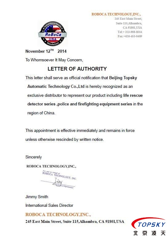 北京凌天成為美國ROBOCA公司在亞太區(qū)的總代理, 美國ROBOCA公司是反恐,救援裝備的制造商,主要產(chǎn)品包括氣動支撐系統(tǒng),雷達生命探測儀,排爆機器人等.