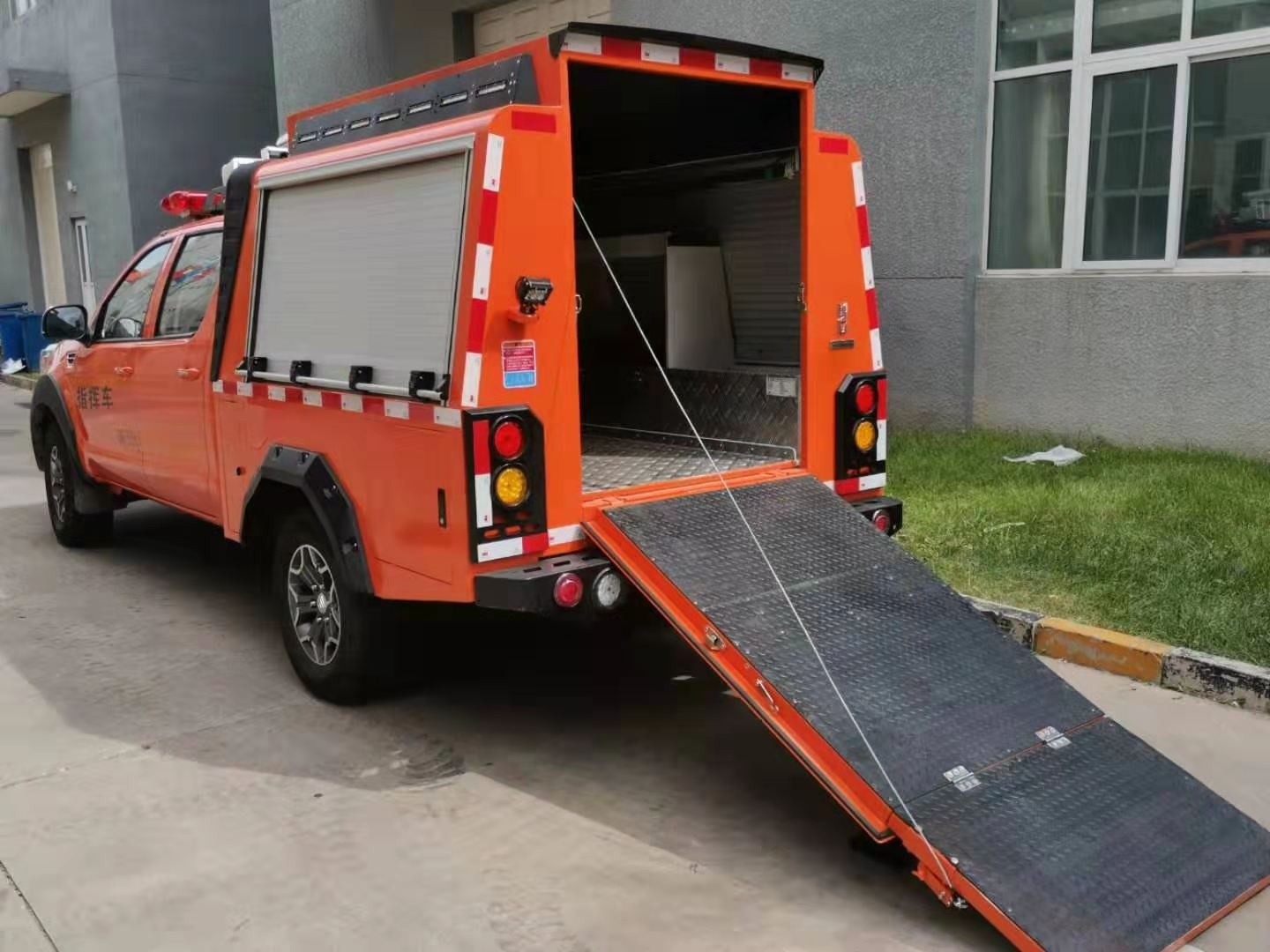 專門為特種機器人量身定做的一款機器人運輸車,由皮卡車改裝,區(qū)別于傳統(tǒng)意義上大型運輸車,體積更小,動力更足。車廂設(shè)計有升降照明系統(tǒng),解決了救援現(xiàn)場能見度低的問題,1.2-1.8米升降高度,可滿足不同照明需求。車體頂部裝有4G圖像傳輸系統(tǒng),可將現(xiàn)場情況實時傳輸?shù)街笓]部,有利于指揮現(xiàn)場調(diào)度。配有一體化機器人裝運梯,最大承壓≥600Kg。后箱四周配有一圈小型照明系統(tǒng),可用于晚間或光線昏暗等環(huán)境。后箱設(shè)計有獨立儲物架,可放置機器人配套設(shè)備。兩側(cè)卷閘窗設(shè)計方便拿用。
