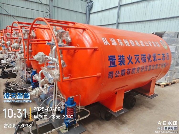 液態(tài)二氧化碳滅火裝置,采用平板車為運載平臺,搭載液態(tài)二氧化碳滅火模塊,采用液態(tài)二氧化碳為滅火劑,運輸至井下火區(qū)近附,經(jīng)自增壓調(diào)控系統(tǒng)實現(xiàn)罐內(nèi)穩(wěn)壓,并通過遠距離輸送管路將液體從罐內(nèi)向密閉火區(qū)噴射,利用其急速膨脹氣化和吸熱效率高的物理特性,可實現(xiàn)惰性降氧,吸熱降溫,吸附阻化等功能,從而可快速進行井下煤層自燃火災(zāi)的預(yù)防與撲滅等。