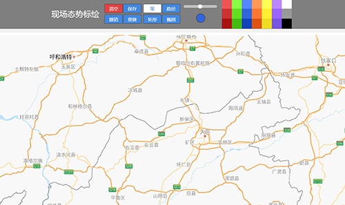 現(xiàn)場態(tài)勢標繪,可進入到地圖中,進行線路的制作、路徑、矩形、圓形等操作選擇,及可對操作步驟進行撤銷及畫筆的顏色選擇