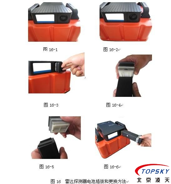 YSR25本安型雷達生命探測儀的雷達探測器配備了兩塊可充電鋰離子電池,其插拔、更換步驟如下,見圖16。