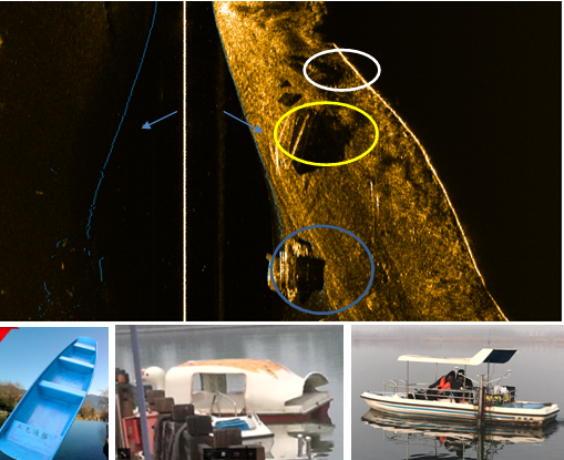 其中,藍(lán)色箭頭指向藍(lán)色線條為自動檢測的水底線,三艘沉船,分別對應(yīng)實物如下,小船約為3米長,大船約為5米長。