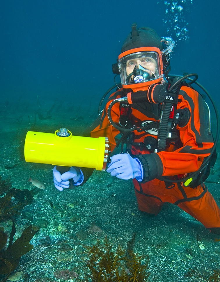 手持聲納設(shè)備為便攜式、組合式的聲納系統(tǒng),由聲吶發(fā)射器和聲吶接收器兩部分組成,可實(shí)現(xiàn)發(fā)射和接收的操作。聲吶發(fā)射器可為潛水員在水下定位水下物體。工作深度100m,頂部帶有指南針,方便在水下辨別方向, 整體為醒目的亮黃色,接收器帶有槍式握把,潛水員可單手操作接收器。