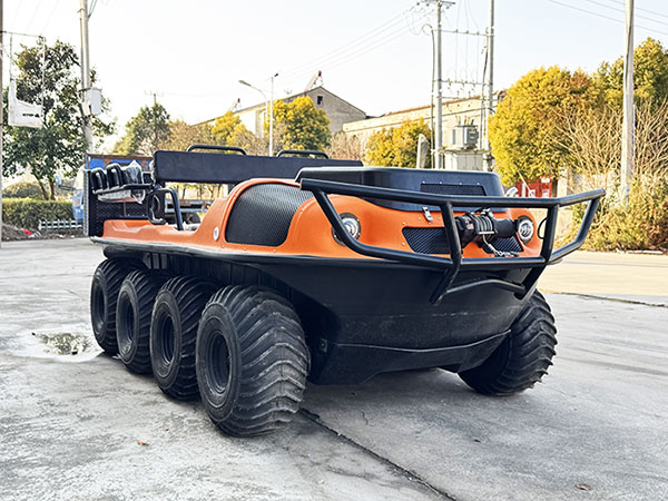 車體采用高分子復(fù)合材料真空一次成型,底盤采用高強(qiáng)度汽車大梁鋼材焊接而成,全密封設(shè)計(jì)適配全場景受力需求,同時(shí)確保車輛在水陸環(huán)境中均能保持穩(wěn)定。