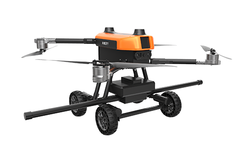 本無人機(jī)為北京凌天智能裝備集團(tuán)研發(fā)的陸空兩棲航磁探測無人機(jī),采用四旋翼機(jī)身設(shè)計,載重大,續(xù)航長,并且機(jī)體折疊標(biāo)準(zhǔn)化負(fù)載接口。同時,該無人機(jī)具備陸空兩棲功能,可以在地面行駛,行走系統(tǒng)可快拆。