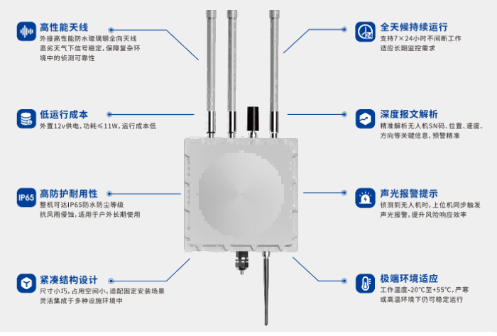 1.該產(chǎn)品是一款集成多種通信模式和能源供應(yīng)的智能無人機探測設(shè)備,采用外置玻璃鋼全向天線,可以對市面上常見消費級無人機實現(xiàn)精準預(yù)警;