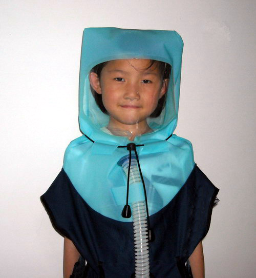 適合兒童(3—8歲)使用,為有效回避戰(zhàn)爭毒氣或有害環(huán)境而設(shè)計(jì)的防毒面罩。利用送風(fēng)機(jī)將外部空氣通過濾毒罐送入頭罩內(nèi),形成密閉正壓,使得呼吸方便,活動(dòng)無不適現(xiàn)象。